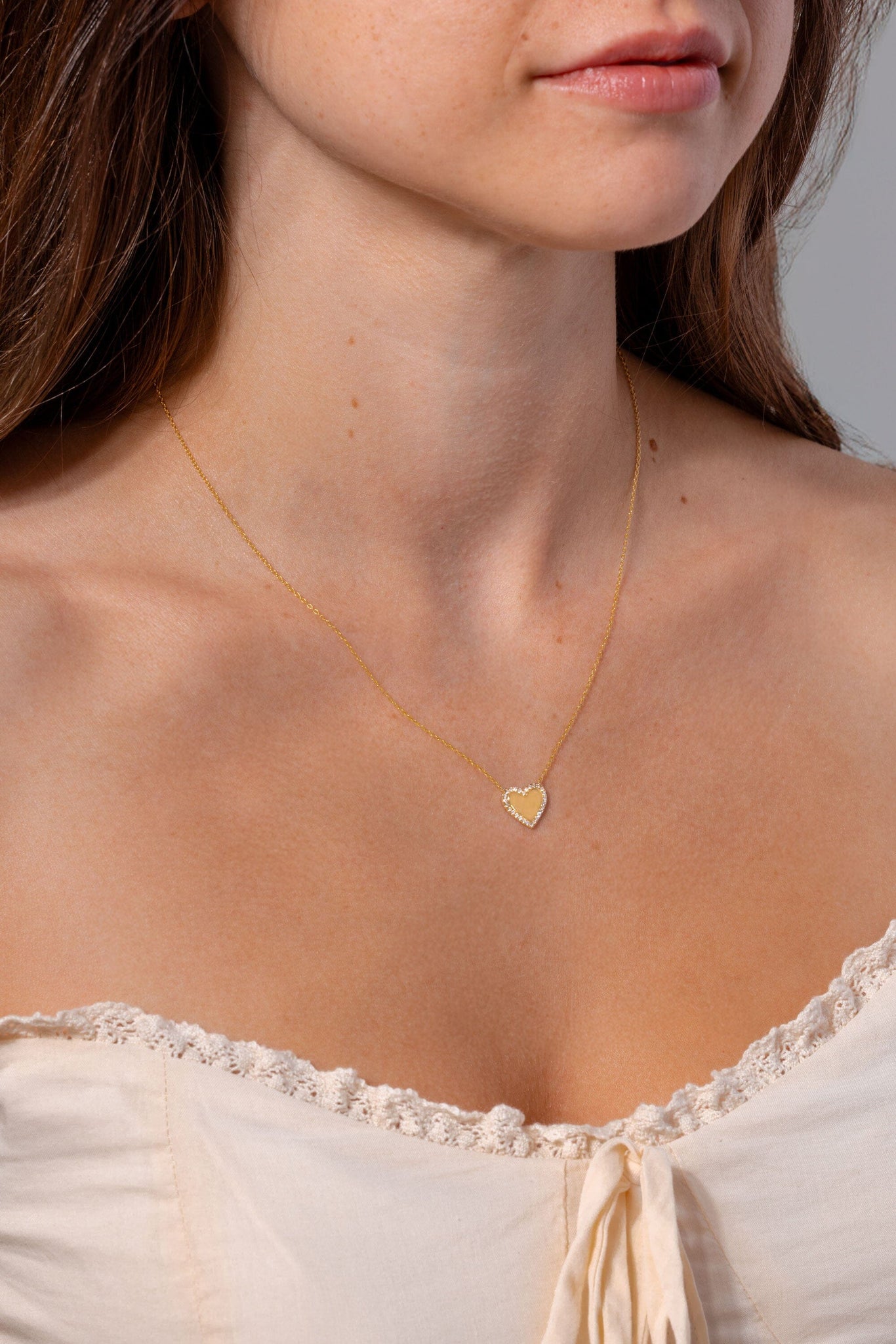 0.12 CT Round Pavé Border Engravable Heart Lab Grown Diamond Necklace in Solid Gold