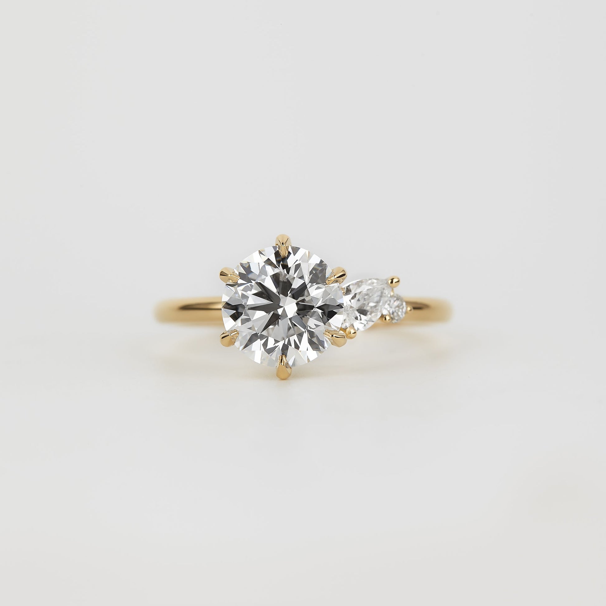 • Side Stones: 0.3 TCW Pear & Round Lab Grown Diamonds (DEF/VVS)