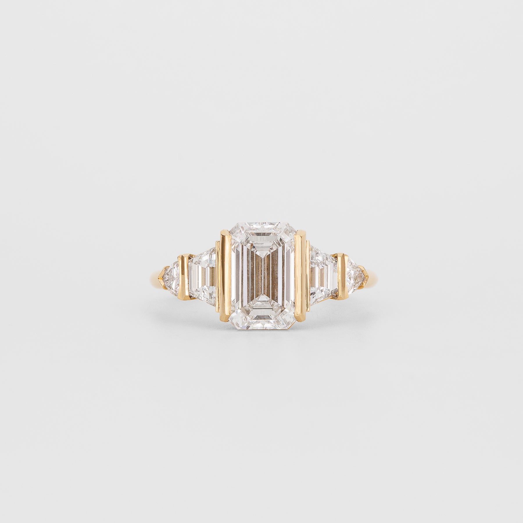• Side Stones: 0.54 CT Trapezoid, 0.19 CT Trillon Lab Grown Diamonds (DEF/VVS)