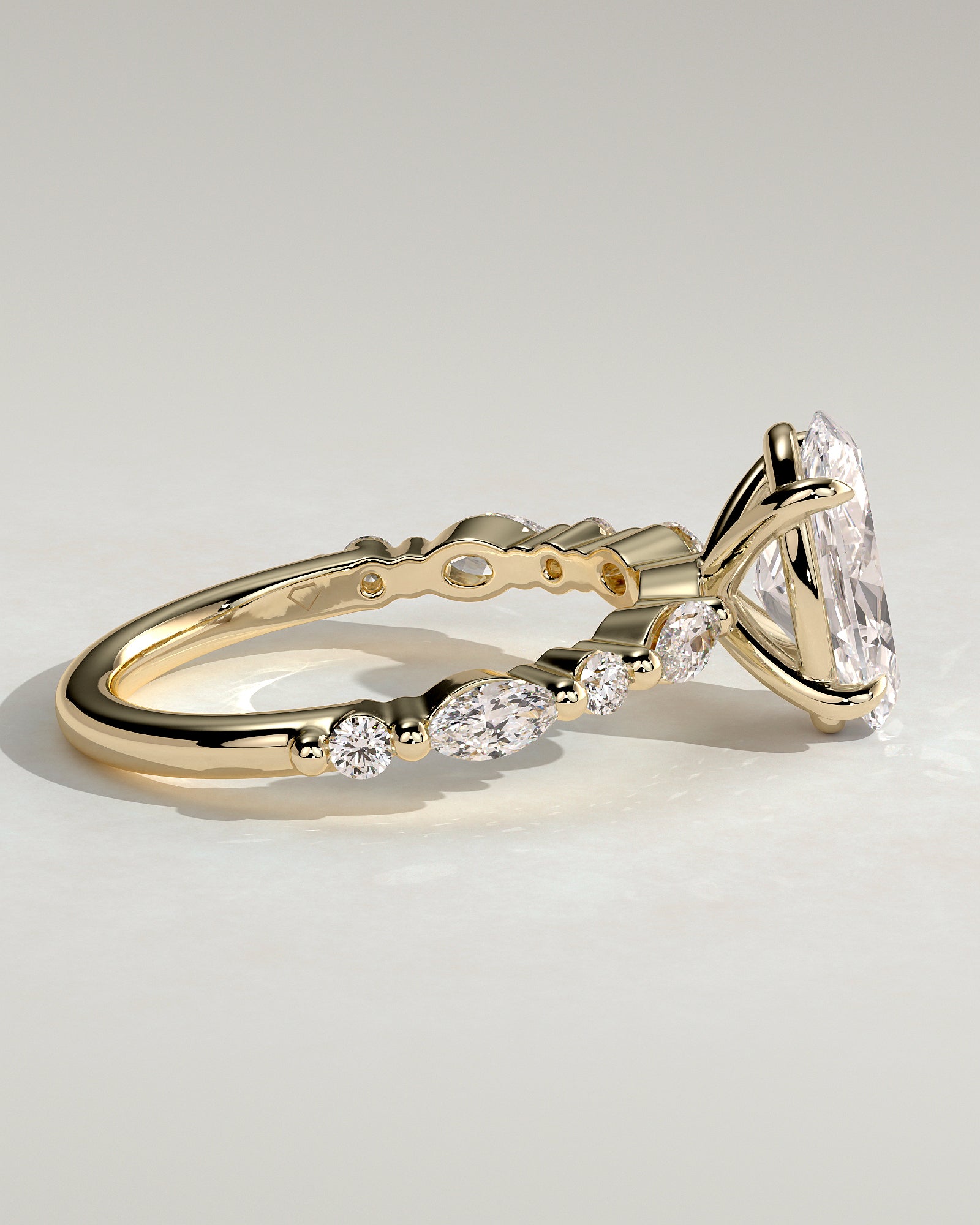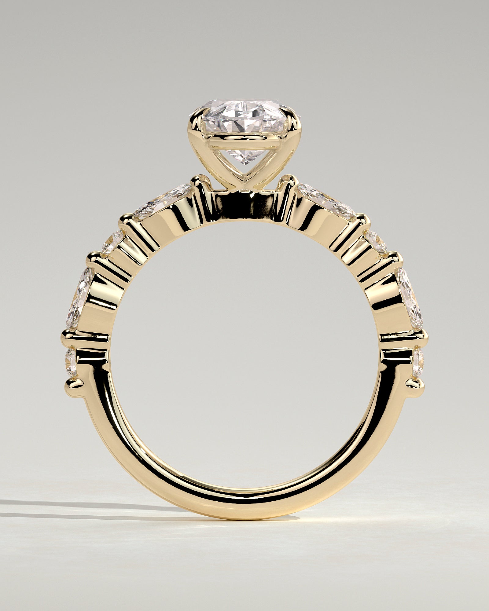 • Side Stones: 0.7 TCW Marquise & Round Cut Lab Grown Diamonds (DEF/VVS)